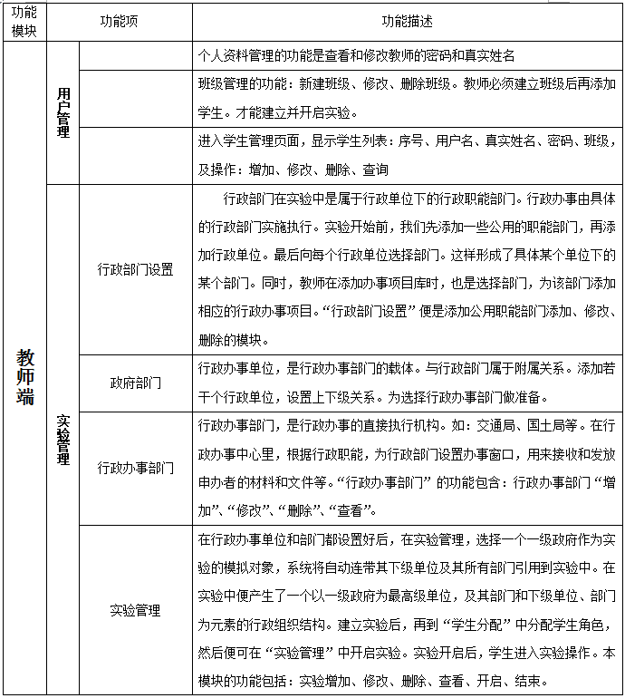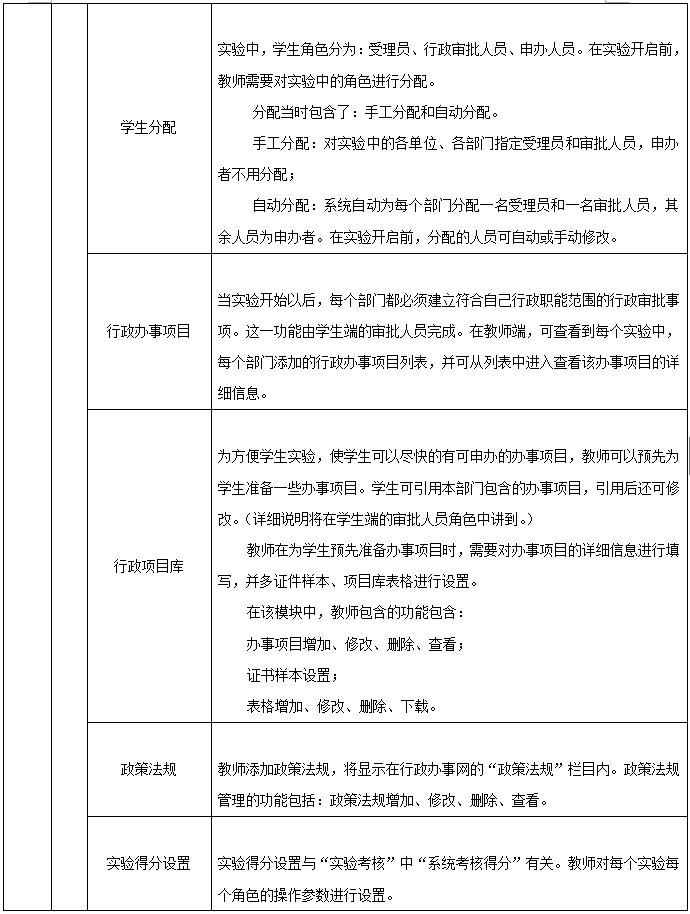 3、教(jiao)師端:行政部(bu)門(men)設置(zhi)、政府部(bu)門(men)、行政辦(ban)(ban)事部(bu)門(men)、實(shi)驗管理、學生分配(pei)、行政辦(ban)(ban)事項目(mu)、行政項目(mu)庫、政策法規(gui)、實(shi)驗得(de)分設置(zhi)、操作結果統計、實(shi)驗操作得(de)分、實(shi)驗報告
