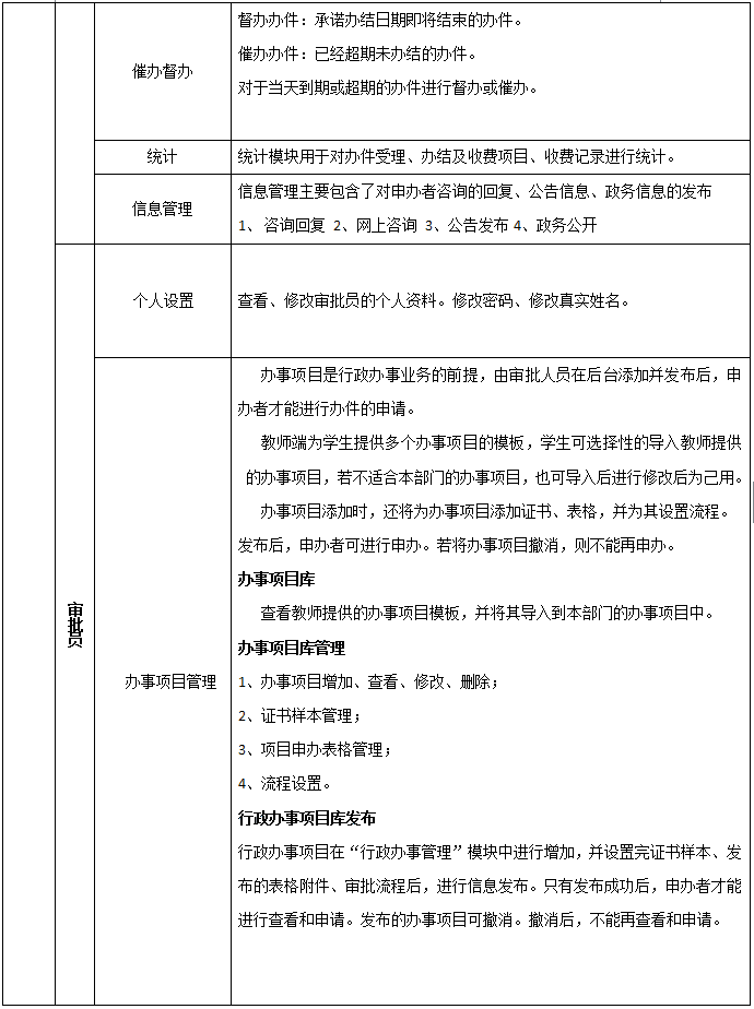 9、審批辦(ban)(ban)(ban)事(shi)(shi)員(yuan):辦(ban)(ban)(ban)事(shi)(shi)項(xiang)目管(guan)理(li)(li)(辦(ban)(ban)(ban)事(shi)(shi)項(xiang)目庫、辦(ban)(ban)(ban)事(shi)(shi)項(xiang)目管(guan)理(li)(li)、辦(ban)(ban)(ban)事(shi)(shi)項(xiang)目發布),對辦(ban)(ban)(ban)事(shi)(shi)項(xiang)目進(jin)(jin)行(xing)添加(jia)、管(guan)理(li)(li)、證書(shu)樣本(ben)、表格(ge)、流程進(jin)(jin)行(xing)管(guan)理(li)(li)。