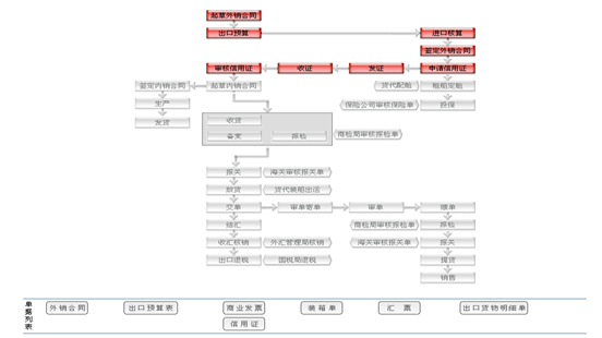 業(ye)務流程(cheng):CIF+L/C,CIF+/D/A,CIF+D/P,CIF+T/T Before shipment CIF+T/T After shipment FOB+L/C,FOB+/D/A,FOB+D/P,FOB+T/T Before shipment FOB+T/T After shipment CFR+L/C,CFR+/D/A,CFR+D/P,CFR+T/T Before shipment CFR+T/T After shipment 業(ye)務流程(cheng):在這里填寫和(he)(he)查看所需要(yao)的(de)單(dan)據(ju)。直接可在流程(cheng)圖(tu)中表(biao)現。查看的(de)單(dan)據(ju)分填寫的(de)單(dan)據(ju)和(he)(he)收到的(de)單(dan)據(ju)