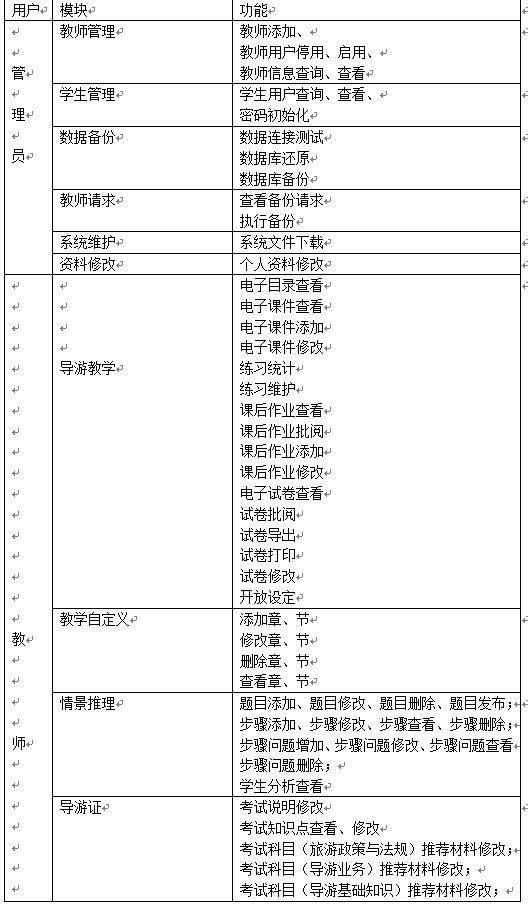 該導(dao)游業務(wu)與技能(neng)(neng)教(jiao)(jiao)學軟件在功(gong)能(neng)(neng)上(shang),以管理(li)員、教(jiao)(jiao)師端(duan)(duan)、學生端(duan)(duan)三種權限設置(zhi)各自功(gong)能(neng)(neng),完(wan)全(quan)能(neng)(neng)滿(man)足旅游業務(wu)與機(ji)(ji)能(neng)(neng)教(jiao)(jiao)學要求。平臺(tai)通過精(jing)彩的(de)內容、強(qiang)大的(de)功(gong)能(neng)(neng)、友好的(de)界面,可靠的(de)性能(neng)(neng),實現導(dao)游業務(wu)與機(ji)(ji)能(neng)(neng)教(jiao)(jiao)學的(de)時代性跨越。