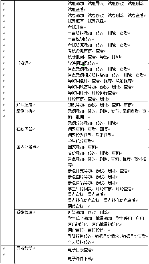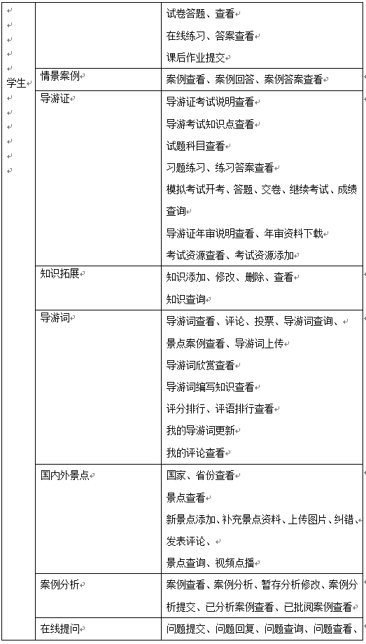 學(xue)(xue)生的(de)主要功能(neng)是導(dao)游(you)教學(xue)(xue)知(zhi)識的(de)學(xue)(xue)習(xi)(xi)、完(wan)成情(qing)景(jing)推理中包含的(de)案例及(ji)題目、導(dao)游(you)證考試學(xue)(xue)習(xi)(xi)及(ji)模擬考試、導(dao)游(you)拓展知(zhi)識學(xue)(xue)習(xi)(xi),同時可添加新的(de)知(zhi)識供其他(ta)同學(xue)(xue)學(xue)(xue)習(xi)(xi)、導(dao)游(you)詞(ci)學(xue)(xue)習(xi)(xi)并編寫導(dao)游(you)詞(ci)、國內(nei)外景(jing)點學(xue)(xue)習(xi)(xi)、案例分析和在線提問。