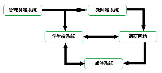 由管理員端(duan)系統(tong)(tong)、教師端(duan)系統(tong)(tong)、學生(sheng)端(duan)系統(tong)(tong)、調研網站(zhan)、郵(you)件系統(tong)(tong)五大部分組成,各部分之間數據(ju)相(xiang)互交流聯系。