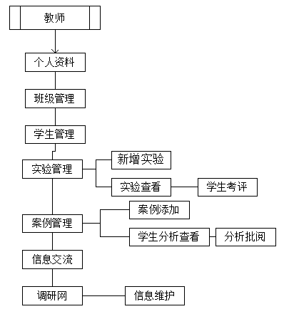 教師端系(xi)統(tong)由班級(ji)管理、學生管理、實(shi)驗管理、案例管理、調(diao)研(yan)網管理、信息交流、信息提示、郵件管理、在線(xian)作業、教師信息十個(ge)功能模塊組成。