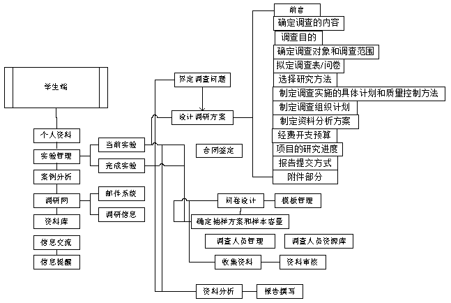 在(zai)學生端系(xi)統(tong),學生根據教師設(she)(she)置(zhi)的(de)實驗(yan)環境確定(ding)(ding)調(diao)研(yan)課題,按步(bu)驟(zou)(zou)完成市場(chang)調(diao)研(yan)設(she)(she)計(ji)(ji)方(fang)(fang)案(an)、調(diao)查(cha)(cha)問(wen)卷,確定(ding)(ding)調(diao)查(cha)(cha)人(ren)員,收集(ji)(ji)及分(fen)析調(diao)研(yan)資(zi)(zi)料,撰寫調(diao)研(yan)報告(gao)。完成教師布(bu)置(zhi)的(de)在(zai)線作業及案(an)例分(fen)析。系(xi)統(tong)提供一個市場(chang)調(diao)研(yan)網(wang)站(zhan),學生可(ke)以(yi)把設(she)(she)計(ji)(ji)的(de)調(diao)查(cha)(cha)問(wen)卷在(zai)這(zhe)里進行發布(bu)以(yi)收集(ji)(ji)資(zi)(zi)料,或通過(guo)電子郵件方(fang)(fang)式向(xiang)參(can)加本(ben)次(ci)實驗(yan)的(de)本(ben)班其(qi)它同學,發送問(wen)卷郵件以(yi)收集(ji)(ji)資(zi)(zi)料。系(xi)統(tong)界面設(she)(she)計(ji)(ji)美觀形象(xiang),將(jiang)復雜(za)的(de)功(gong)能配以(yi)人(ren)性化(hua)的(de)操(cao)作步(bu)驟(zou)(zou)設(she)(she)計(ji)(ji),能盡(jin)快幫(bang)助(zhu)用戶掌握(wo)其(qi)方(fang)(fang)法及步(bu)驟(zou)(zou)