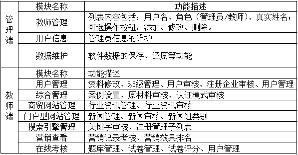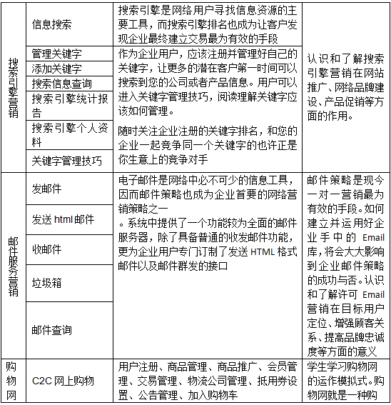 1、軟(ruan)件用戶(hu)從初次訪問企業網(wang)站(zhan)(zhan)(zhan)到(dao)跟該企業訂(ding)購產品的(de)(de)整個過程,可將其(qi)分成三個階(jie)(jie)段:網(wang)站(zhan)(zhan)(zhan)建設(she)階(jie)(jie)段、營銷推廣階(jie)(jie)段和(he)在線業務管理(li)階(jie)(jie)段。模塊中應包括:網(wang)站(zhan)(zhan)(zhan)建設(she)、搜索引擎營銷、郵件推廣、網(wang)絡溝通、信息(xi)搜索與發布、搜索引擎優化、網(wang)絡廣告制作(zuo)、、客戶(hu)服務、在線銷售(shou)等技能的(de)(de)專(zhuan)項(xiang)實(shi)訓,也能將專(zhuan)項(xiang)實(shi)訓匯總,方便學生(sheng)開(kai)展(zhan)企業網(wang)站(zhan)(zhan)(zhan)綜(zong)合營銷、作(zuo)出網(wang)絡營銷效果評(ping)估等的(de)(de)集中實(shi)訓。