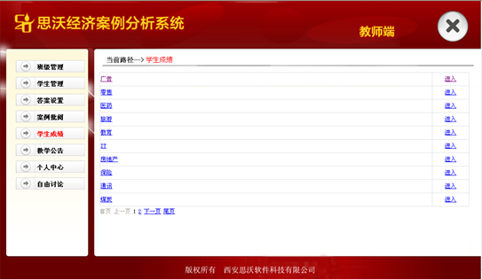 思沃經(jing)濟管(guan)理案例(li)分析(xi)(xi)系統包括產(chan)(chan)業(ye)分析(xi)(xi)、典(dian)型(xing)案例(li)、經(jing)管(guan)調研(yan)、實踐報告(gao)、教(jiao)學公告(gao)、成(cheng)績查看(kan)六個模塊,內容涵蓋(gai)我(wo)國主(zhu)要經(jing)濟產(chan)(chan)業(ye)和全國各地的主(zhu)要典(dian)型(xing)企業(ye),可以(yi)為學生學習和老師教(jiao)學提供一個立體實訓平臺,有很好的教(jiao)學互(hu)動性。 ?產(chan)(chan)業(ye)分析(xi)(xi)